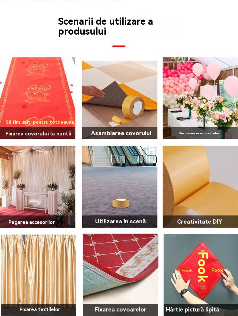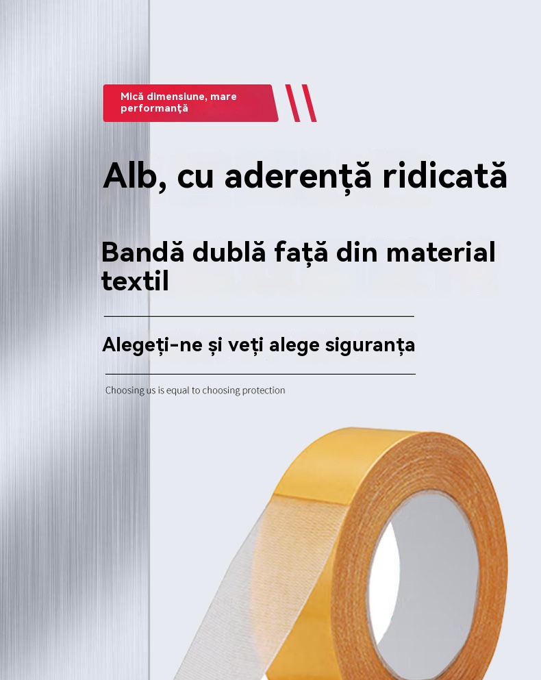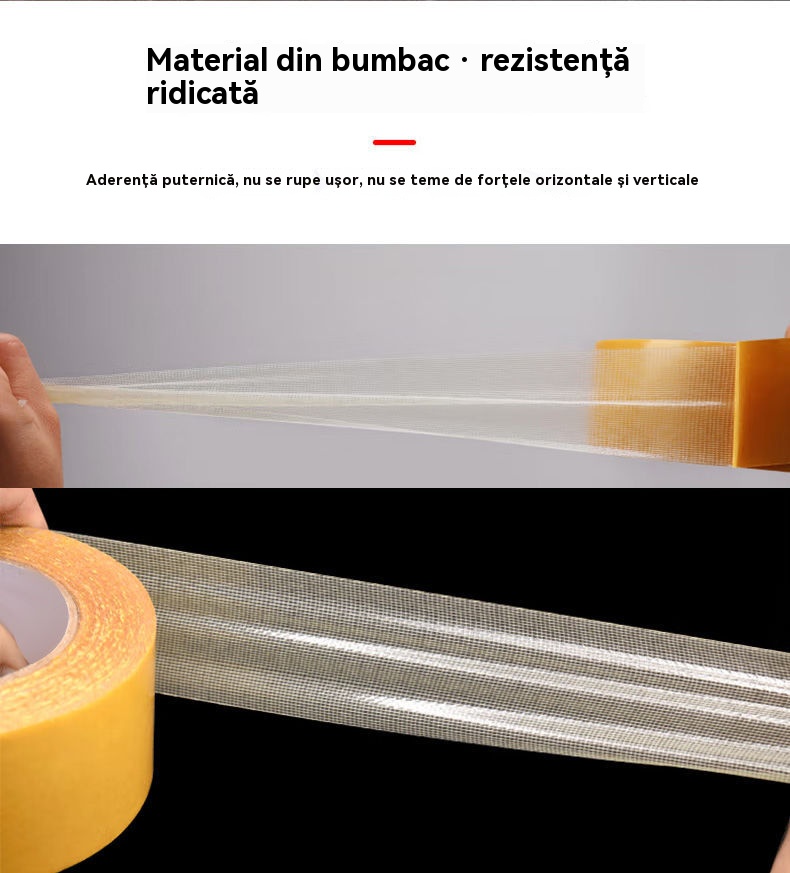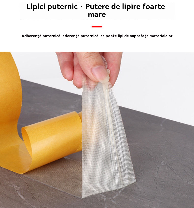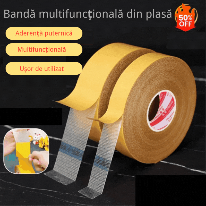 Bandă adezivă multifuncțională cu plasă, față dublă, aderență puternică, fără a lăsa reziduuri de lipici.